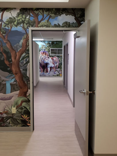 vinyl murals for the waiting area, hallway and treatment room with a tropical theme